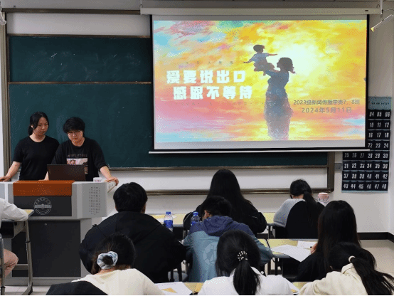 “同學(xué)們,猜一猜明天是什么節(jié)日啊?”“母親節(jié)!”5月11日,新聞傳播學(xué)類專業(yè)2023(7)、(8)班在K202教室開展以“愛要說出口,感恩不等待”為主題的團(tuán)建活動(dòng)。活動(dòng)開始前,活動(dòng)負(fù)責(zé)人、新聞傳播學(xué)類專業(yè)2023(7)、(8)班的班長楊雨霏、朱研溪提前為每位同學(xué)準(zhǔn)備好信紙和信封。朱研溪說:“我們希望通過寫信這種傳統(tǒng)而深情的溝通方式,讓同學(xué)們勇敢表達(dá)自己的心聲,將對母親的愛訴說于筆尖。”學(xué)生們觀看一段關(guān)于母愛的感人短片后,...